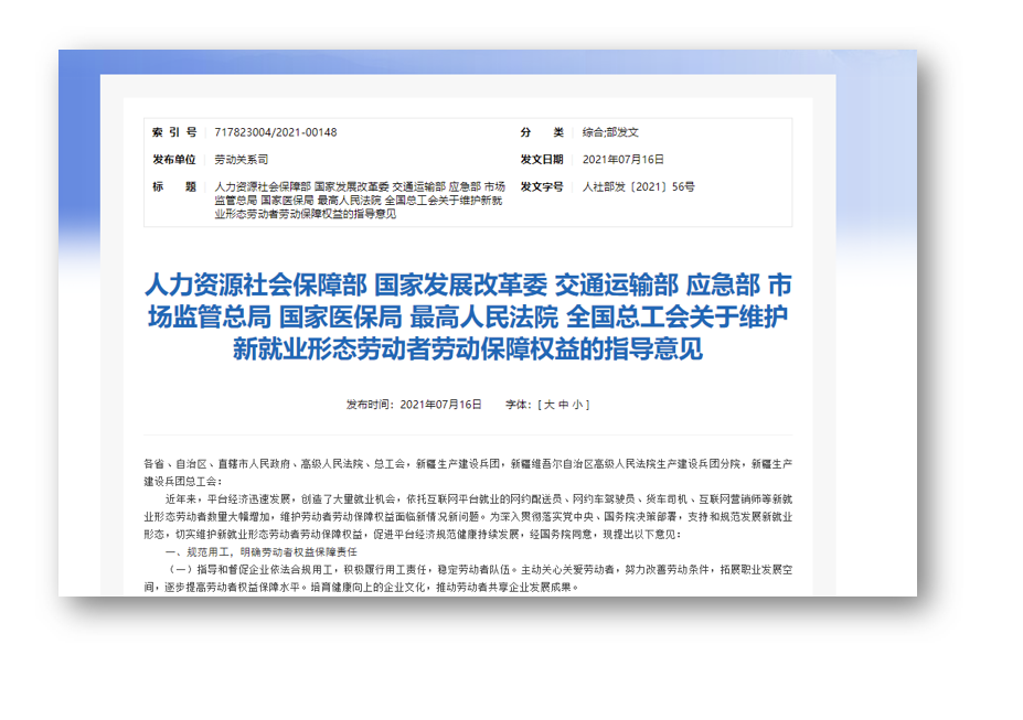 “2021年7月16日,人力資源和社會保障部等八部門聯合發佈的《關於維護新就業形態勞動者勞動保障權益的指導意見》提出: