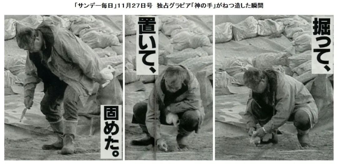 終於,2000年11月4日,《每日新聞》的記者事先在發掘現場埋伏,成功拍攝到了藤村新一的偽造行為,他從一隻塑料袋內拿出所謂“舊石器”埋進上高森考古遺址,這一幕被攝影記者抓個正着並曝光。