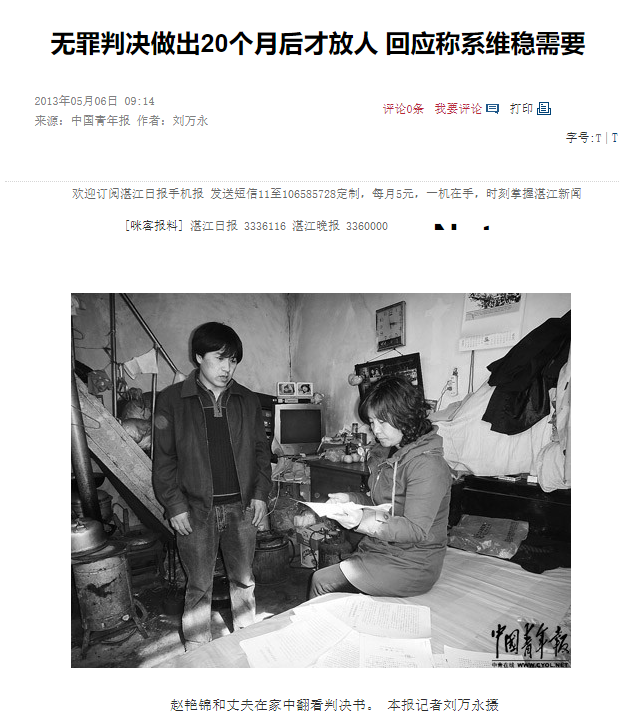 但法院並不放人,繼續關押趙豔錦近兩年——最無恥的是,他們居然在裁決趙豔錦無罪之後,繼續關押趙豔錦並把替妻子呼冤的李建軍勞教了300天。