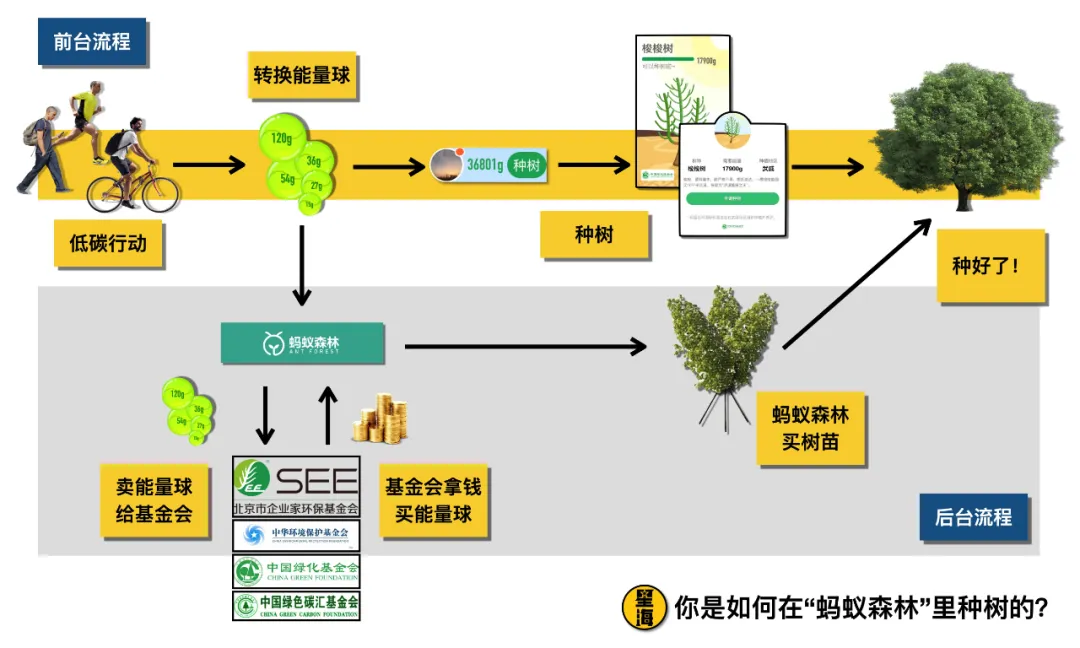 當你點擊“種樹選項”,其實並不是直接將能量球兑換成了樹。能量球其實是被公益基金會買走了。但這筆“錢”沒有打到你的賬上,螞蟻或慈善基金會作為代管方,拿着這個錢去買了樹,再幫你把樹拉到阿拉善給種了下去。
