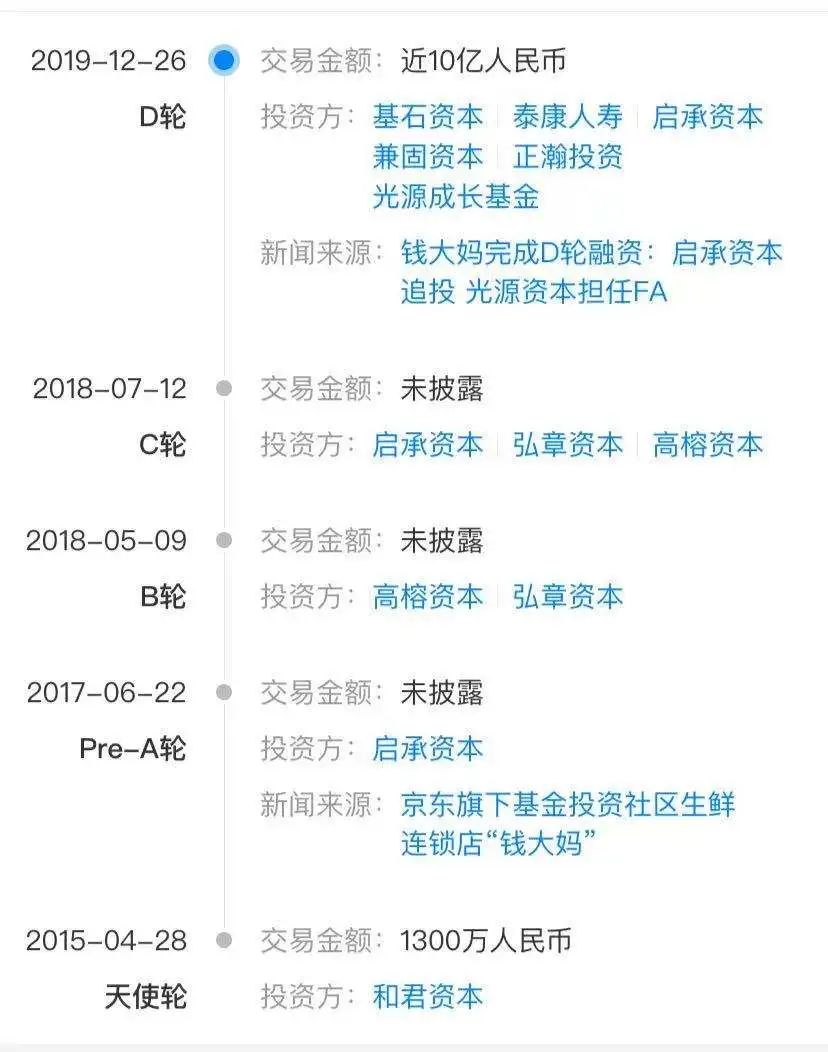 錢大媽門店數出現高速增長是在2017年之後。彼時,京東牽頭髮起的私募股權成長基金啓承資本入局,錢大媽一年猛開700家店,而這一年裏,錢大媽又獲得了兩筆融資。