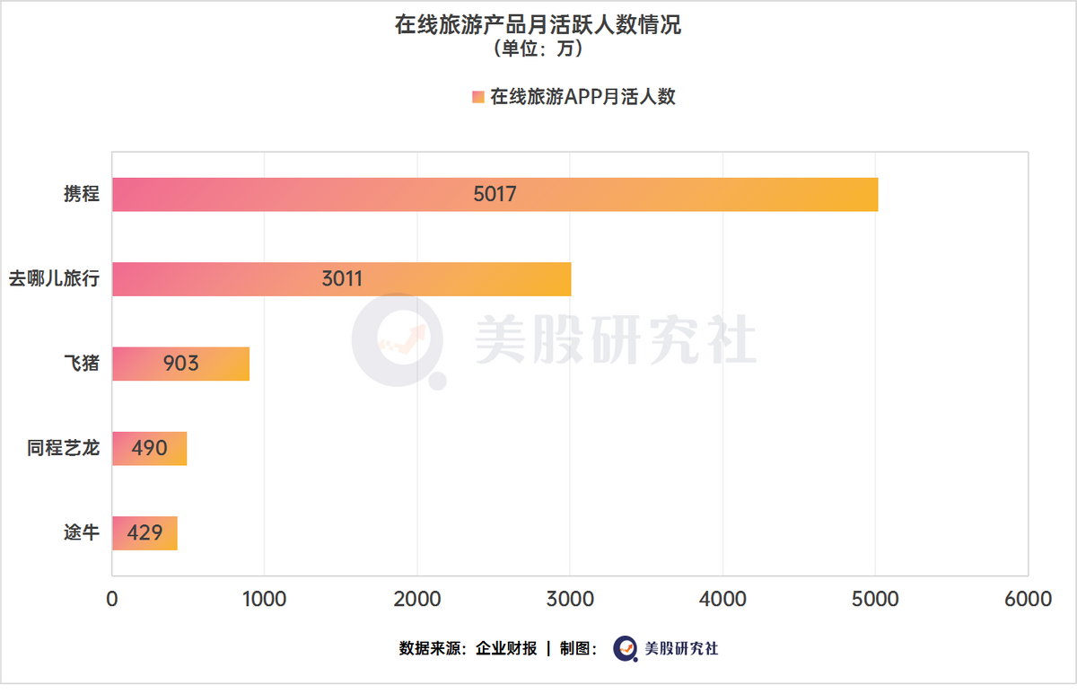 根據網經社電子商務研究中心發佈的《在線旅遊互聯網產品用户活躍人數排行榜》,途牛在今年4月、5月的月活用户數均維持在430萬左右。然而,5月份同程藝龍、飛豬、去哪兒旅行、攜程的月活用户數分別為490萬、903萬、3011萬、5017萬。