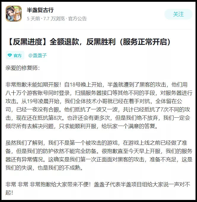 只是這種程度的曝光顯然不足以讓黑客們停手。時間過去還不到兩週,十字星工作室的《半盞復古行》同樣在開服當天遭到了DDoS攻擊。