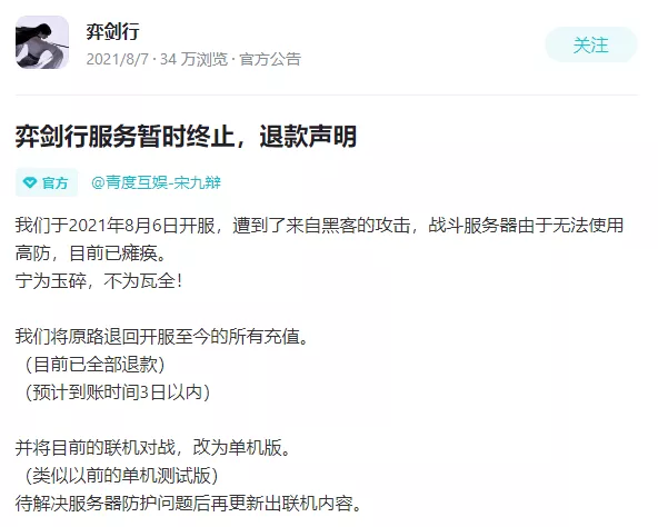 八月初上線的《弈劍行》在被黑客勒索後,開發團隊選擇了直接停服下線,拒絕向黑客團隊交納贖金,因此而受到了關注。這場風波讓許多人意識到已經有大量小型開發商遭到了DDoS攻擊的荼毒;