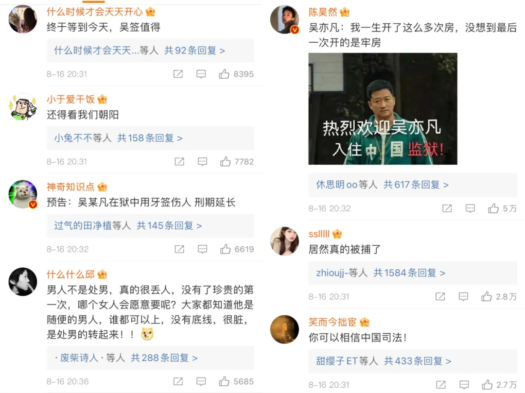到了6月初,吳某凡的性醜聞被曝光,從7月31日被刑拘,再到8月16日被批准逮捕,兩個月都不到的時間內,吳某凡這棵紮根娛樂圈十年的大樹終於轟然倒塌。