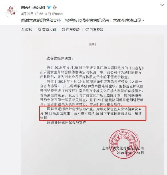 (2019年,韓雪在明知自己無法唱歌的情況下,選擇採用錄音素材演出音樂劇《白夜行》)