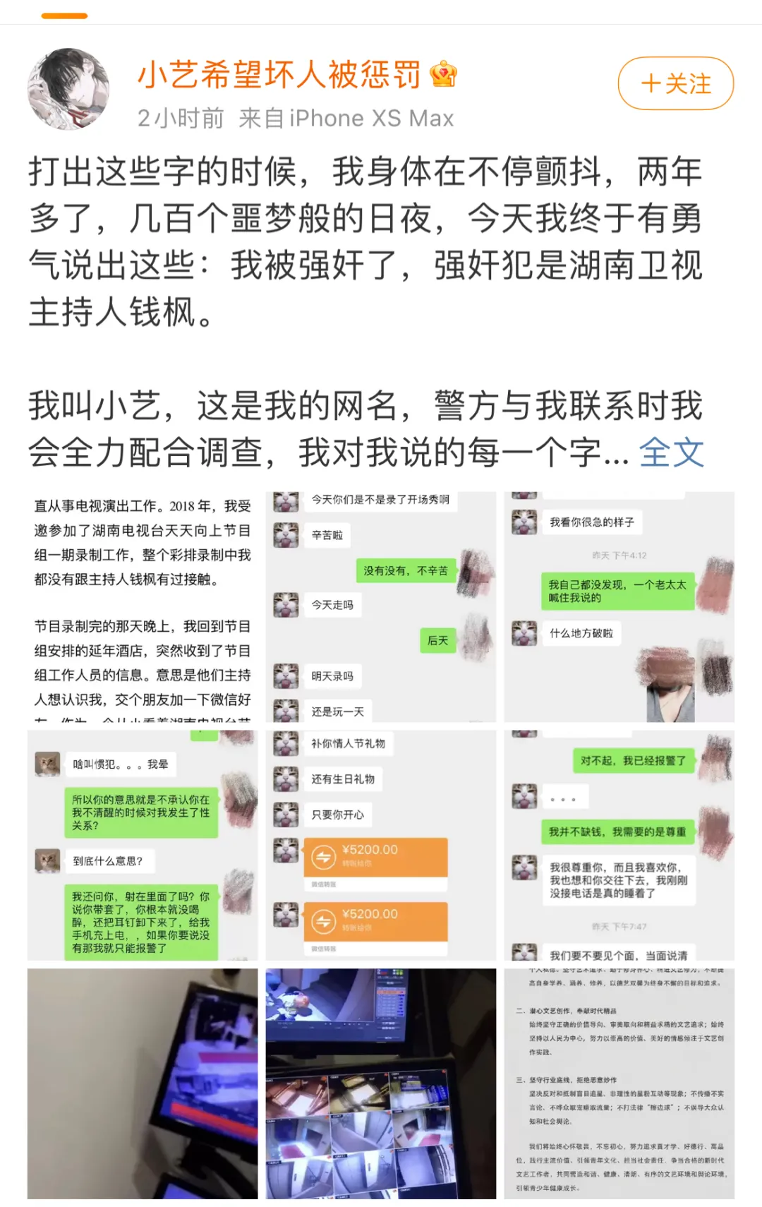 一位自稱小藝的女孩發文稱,2019年她被錢楓勸喝很多果酒後不省人事,隨後被帶回住處,然後第二天早上發現被強姦。