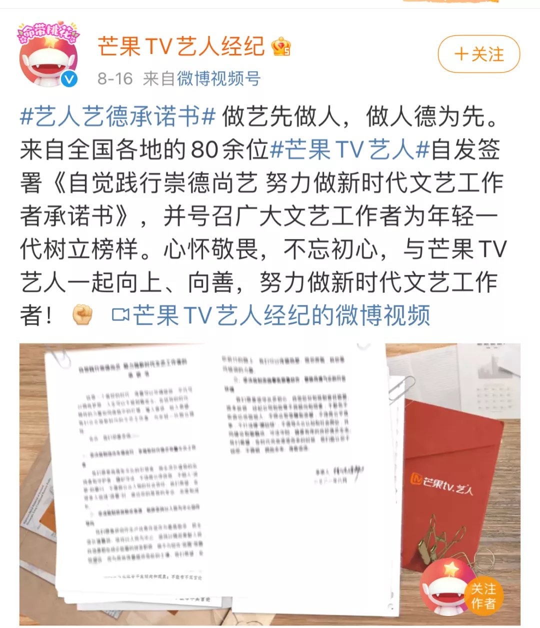 就在8月17日,芒果TV率先行動,召集了80多位藝人簽署下了**“藝人藝德承諾書”**,號召廣大文藝工作者為年輕一代樹立榜樣。