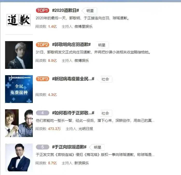 (2020年最後一天,已被實錘多年的於正和郭敬明終於承認抄襲、並道歉)
