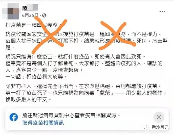 “高端疫苗”是一種精神安慰劑(甚至還不安全),但在陸之駿等綠營支持者眼裏,打與不打,是政治立場問題,打了,就有了一種“政治標籤”。