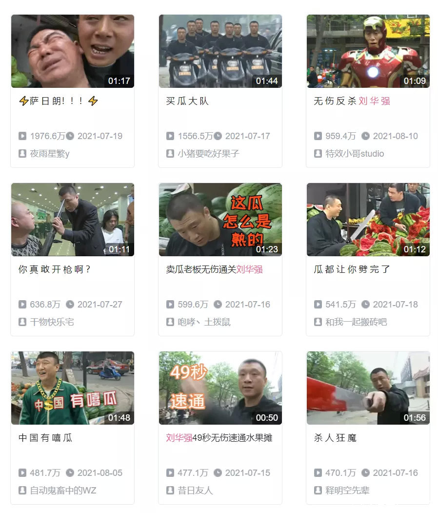 劉華強也能性情大變,成為社恐患者,五過瓜攤才終於將所有西瓜帶回家。或是當水果攤老闆重傷倒地,眾路人視而不見,劉華強騎着摩托前來拯救老闆再瀟灑離開,讓“正道的光”照耀臉龐。當然,在二次創作作品中,劉華強還可以作為中國代表隊選手,參加“東京奧運會男子劈瓜”項目的決賽,並奪得冠軍。