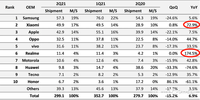 值得一提的是,儘管三星(全球出貨量排名第一)的高端機型壁壘穩健,但在市場營銷以及出貨量方面,該企業表現並不盡如人意。