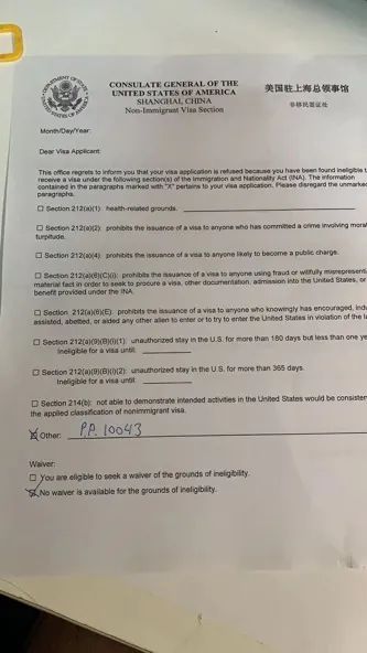 通知郵件中對“拒籤理由”的説明,提及了美國移民法一項條文——212(f),旨在限制對美國國家利益有害的非移民入境,但呂博思不明白的是,她究竟如何有害,沒有具體解釋。今年3月,她在北京申請加急簽證,再次被拒。