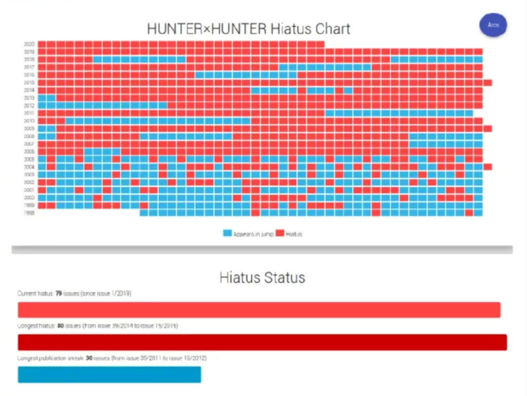 富堅義博每次重更《全職獵人》,都在努力創造着新的休更記錄。比如在2020年休刊81期(614天),就打破了他曾在2014-2016年自己創下的最長連續休刊80期記錄,被網友們廣而告之。