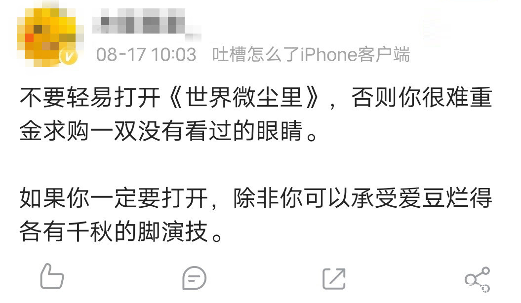 而秀人的劣勢也很明顯,即以近期有兩部劇在播的翟瀟聞為例,雖然國民劇《親愛的爸媽》和愛奇藝頭部甜寵劇《世界微塵裏》都有不錯的番位,但表演方面的能力不足也被放大,原聲台詞發音吞吐不清的問題,在對手演員閆妮、張柏嘉面前宛如不同次元演員表現,讓觀眾大為出戏。