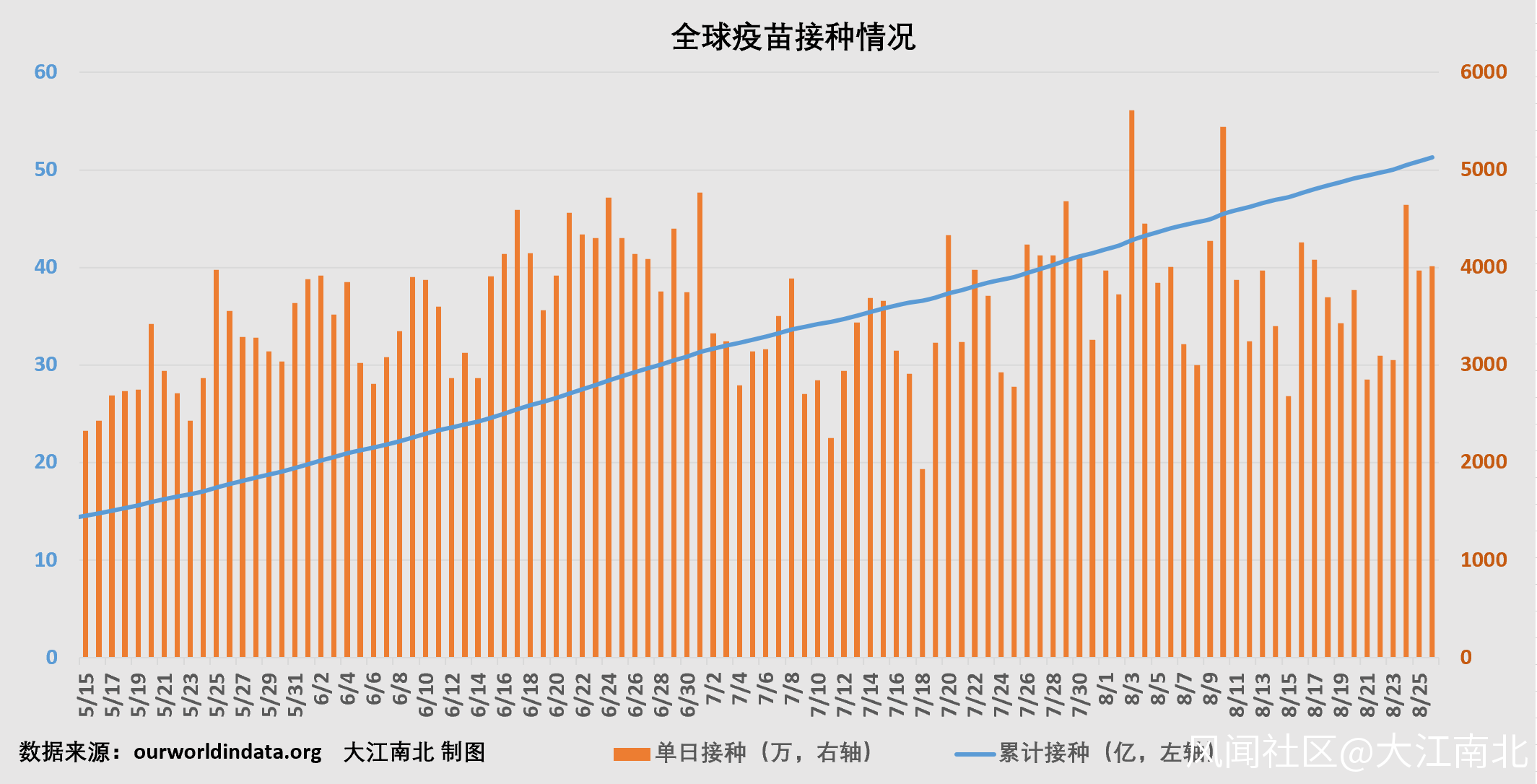 截止2021年8月26日,全球累計接種新冠疫苗51.30億劑;**其中單日接種4016萬劑;**平均每百人接種65.14劑,環比增加0.51劑。