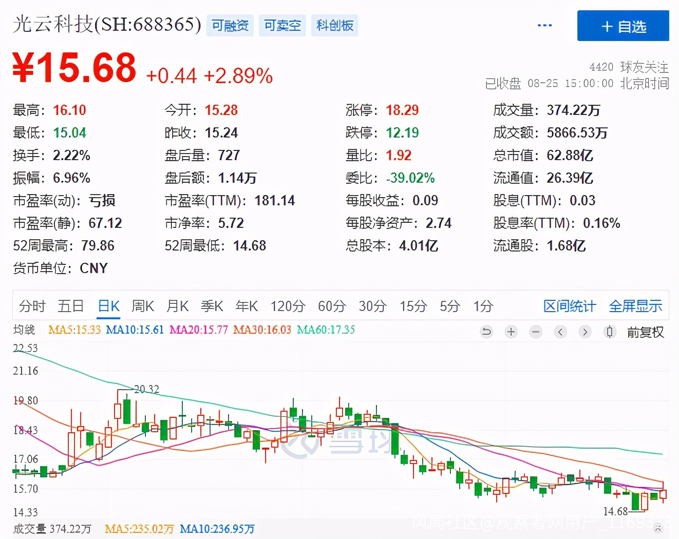 資本市場表現上,截止8月24日A股收盤,光雲科技股價下跌了1.87%,報15.24元/股。可見,市場對光雲科技這份半年報不甚滿意;但在8月25日,股價卻拉漲了2.89%,總市值達到62.88億元。