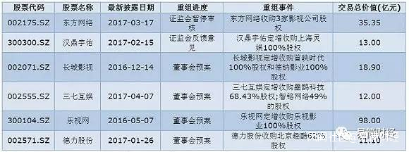 當時,被證監會出手擋住的文化娛樂類企業併購重組案,並非只有這一個,還有以下案例: