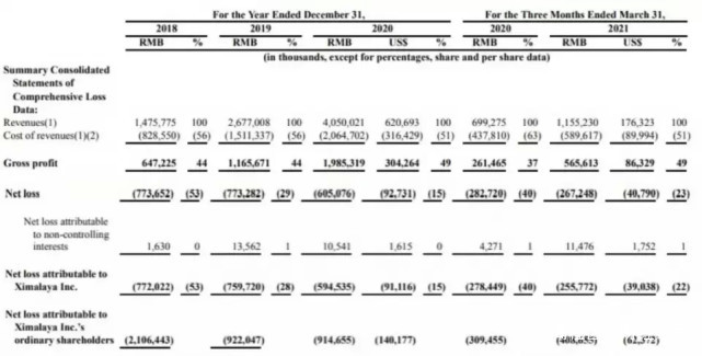 據招股書顯示,喜馬拉雅在2018、2019以及2020年,分別淨虧損7.74、7.73以及6.05億元;2021年一季度,喜馬拉雅再次錄得淨虧損2.67億元。