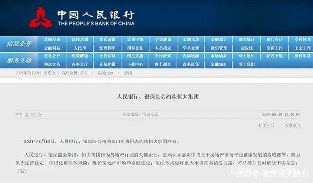 人民銀行、銀保監會指出,恒大集團作為房地產行業的頭部企業,必須努力保持經營穩定,積極化解債務風險,維護房地產市場和金融穩定。