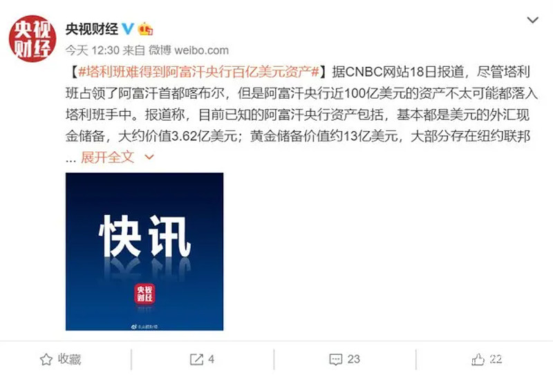據前阿富汗央行行長艾哈邁迪透露,截至他15日離開阿富汗前的一週,阿富汗央行擁有包括外匯和黃金在內的資產總額達90億美元。