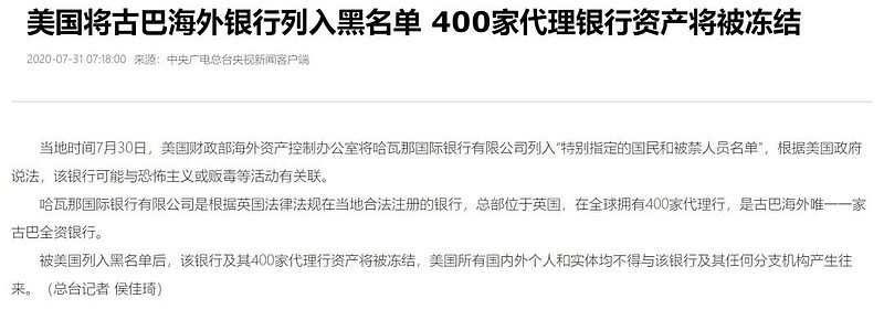 該公司是古巴在海外唯一一家全資銀行,在全球擁有400家代理行,被美國凍結,意味着古巴在海外的錢袋子被美國捏住了。