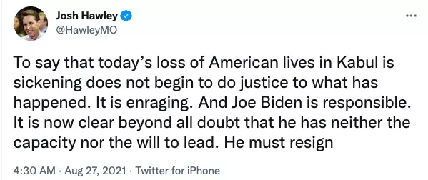 另一個共和黨議員Josh Hawley表示,必須説美國人在喀布爾喪命令人憤怒,拜登要為此負責。現在很清楚了,毫無疑問,拜登既沒有領導能力,也沒有領導意願。他必須辭職!