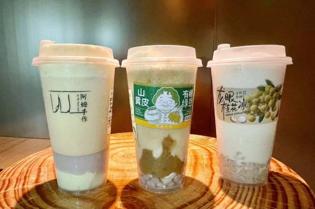 **再看手作的產品效果:**我分別點了龍眼桂花冰、山黃皮有機綠豆、手作米麻薯奶茶3款。桂花龍眼冰是打碎的龍眼和桂花凍的組合,芋泥奶茶的順滑口感印象深刻。