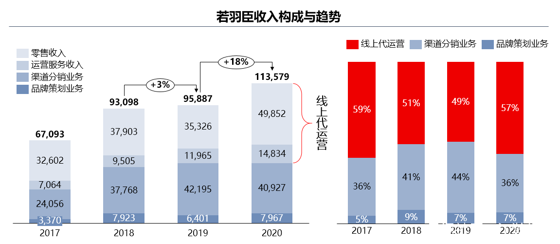 成立於2011年的若羽臣是一家電子商務綜合服務提供商,其主要業務模式包括線上代運營業務(零售業務、服務業務)、渠道分銷業務和品牌策劃業務,其中線上代運營服務是其最主要的收入來源,營收佔比達到57%(2020)。