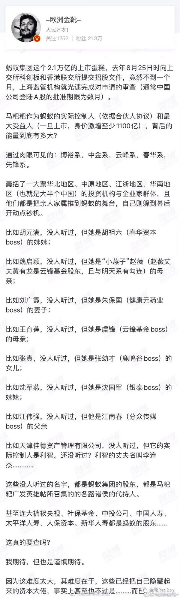 馬粑粑作為螞蟻的實際控制人(依據合夥人協議)和最大受益人(一旦上市,身價激增至少1100億),背後的能量到底有多大?通過肉眼可見的:博裕系,中金系,雲峯系,春華系,先鋒系。