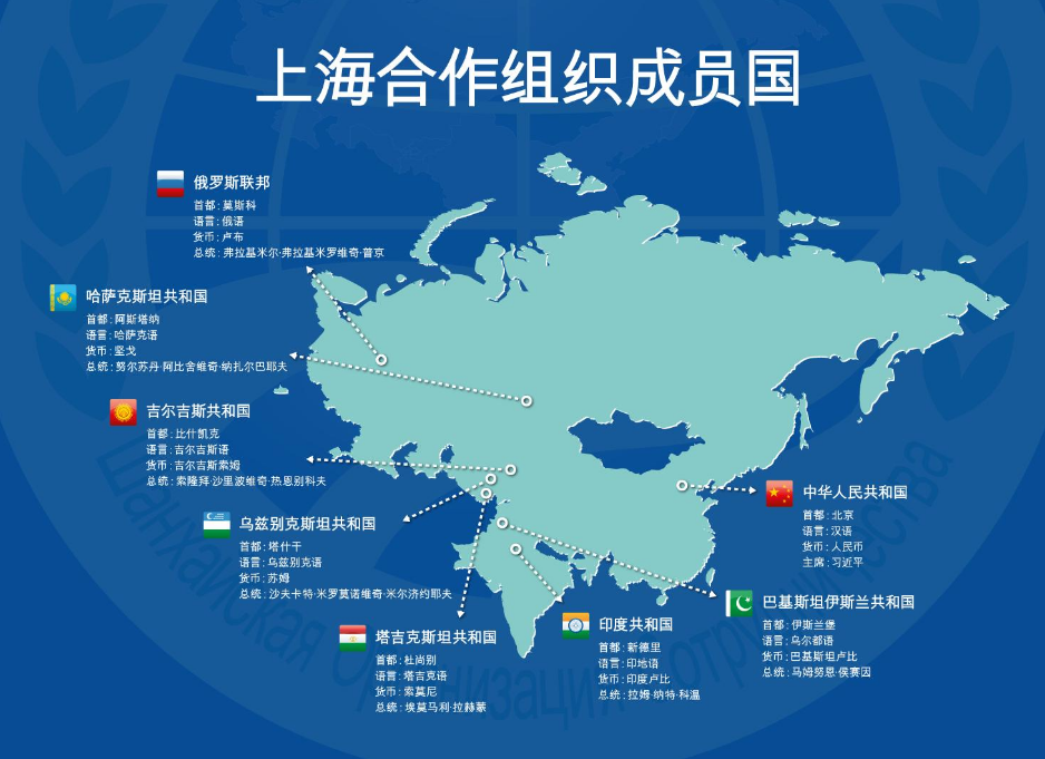 下面我們再在世界地圖上看看上合組織成員國組成。