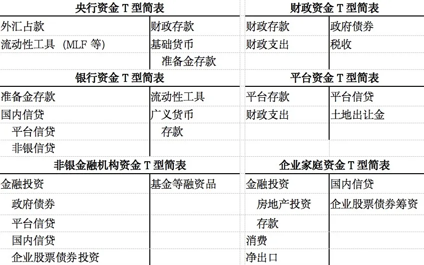 簡表包括央行和財政部門、銀行和非銀金融機構、融資平台和其他實體經濟共六大類經濟主體,分別列示其資金來源和運用的主要科目。左邊為央行、商業銀行和非銀行金融機構的資金簡表,説明金融體系的信用創造和貨幣派生關係;右邊分別為財政部門、地方融資平台以及企業和家庭等實體經濟的資金簡表,説明商品的生產、投資、消費及進出口等情況。