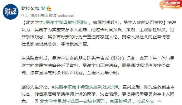 吳謝宇家屬不希望吳被判處死刑(圖源:@財經雜誌微博)