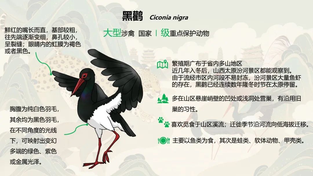 四大旗艦物種之一的黑鸛,是非常優雅的鳥類,每年冬天會留在太原市區越冬。