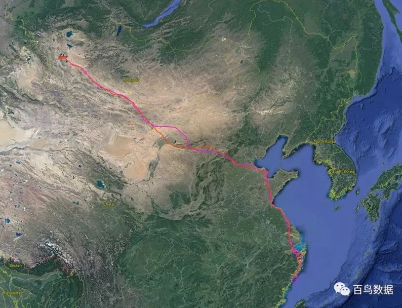 這是去年安裝衞星追蹤器所描繪的卷羽鵜鶘的遷飛軌跡,大家可以看到非常重要的一個補給點就是在大同地區。它們在大同地區補給後繼續向西北方向遷飛。