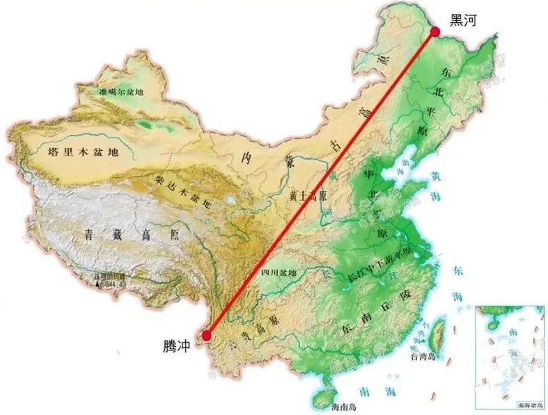 圖片是胡煥庸線的示意圖,從黑龍江省黑河市到雲南省騰衝。這條線以東,43.8%國土居住着94.1%人口。