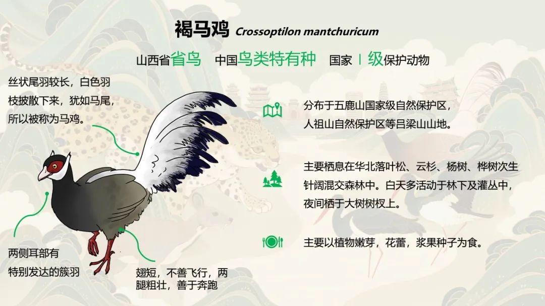 褐馬雞主要生活在山地林區,多以植物的嫩芽包括植物種子為食。和其他的野生雉類比,它的個頭較大,從頭到尾超過一米。