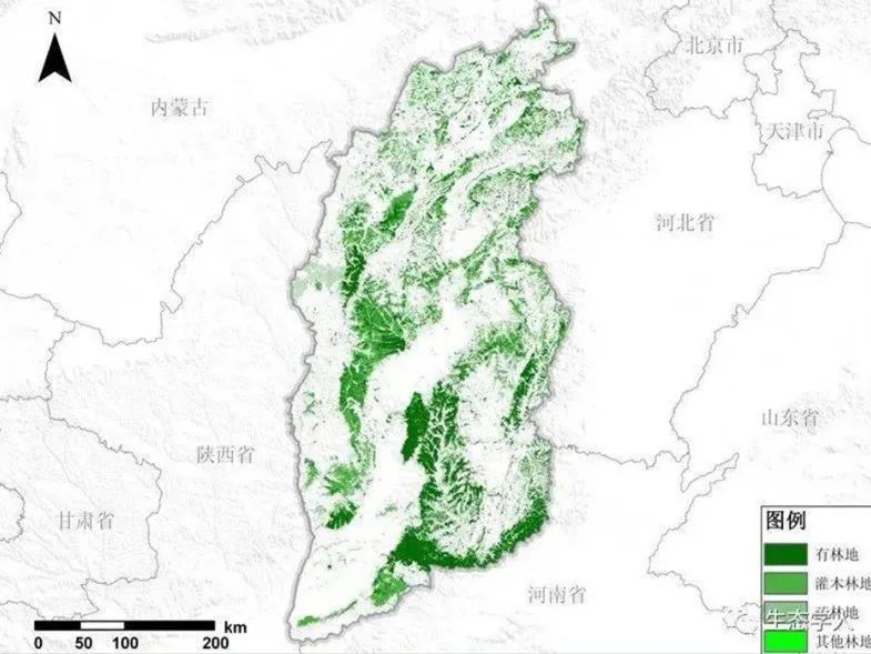 這是山西的植被分佈情況,據林業部門統計,到2020年左右,山西森林覆蓋率能達到23%。