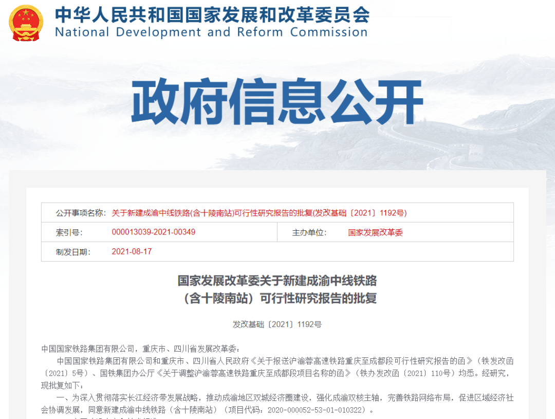 同一天,國家發改委網站掛出關於成渝中線鐵路可行性研究報告的批覆文件,旨在“深入貫徹落實長江經濟帶發展戰略,推動成渝地區雙城經濟圈建設,強化成渝雙核主軸,完善鐵路網絡佈局,促進區域經濟社會協調發展”。
