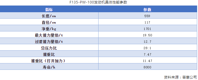 F-135系列的核心機和主要結構與F-119基本一致,但其工作温度、發動機空氣流量和涵道比都有所改善。現在的F-135系列發動機分為兩種型號,一種是常見的PW-100型發動機,另一種則是使用更先進材料的PW-400型發動機。從性能上看,F135面對他國大部分現役同類發動機時,都有着巨大的推重比/總推力優勢,以該系列最常見的子型號PW-100為例,它的最大推力達到19.5噸,推重比達到11.5。即使不開加力,它的最大推力接近了13噸,而目前配備殲-20的渦扇-10B發動機即使開啓加力,最大推力也只有14噸左右!