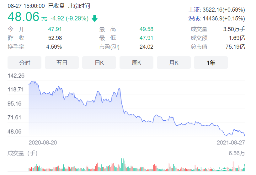 除了財報的不理想,小熊的大盤走勢近一年來一直是肉眼可見的低迷狀態。2019年掛牌上市後市值飆漲4倍、超220億元的風光持續不長,從最高點的165.9/股跌至最低點的49.24/股,即使相比較於8月27日的收盤價48.06/股,跌幅超60%,市值蒸發近100億元。
