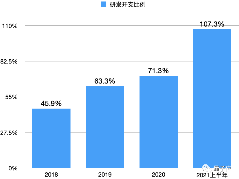 2018年,研發人員工資福利一項支出為5.127億元,而到了今年上半年,僅半年時間,該項支出就達到了12.853億元,已經佔到公司研發投入的72.5%,更是佔營收的77.8%。