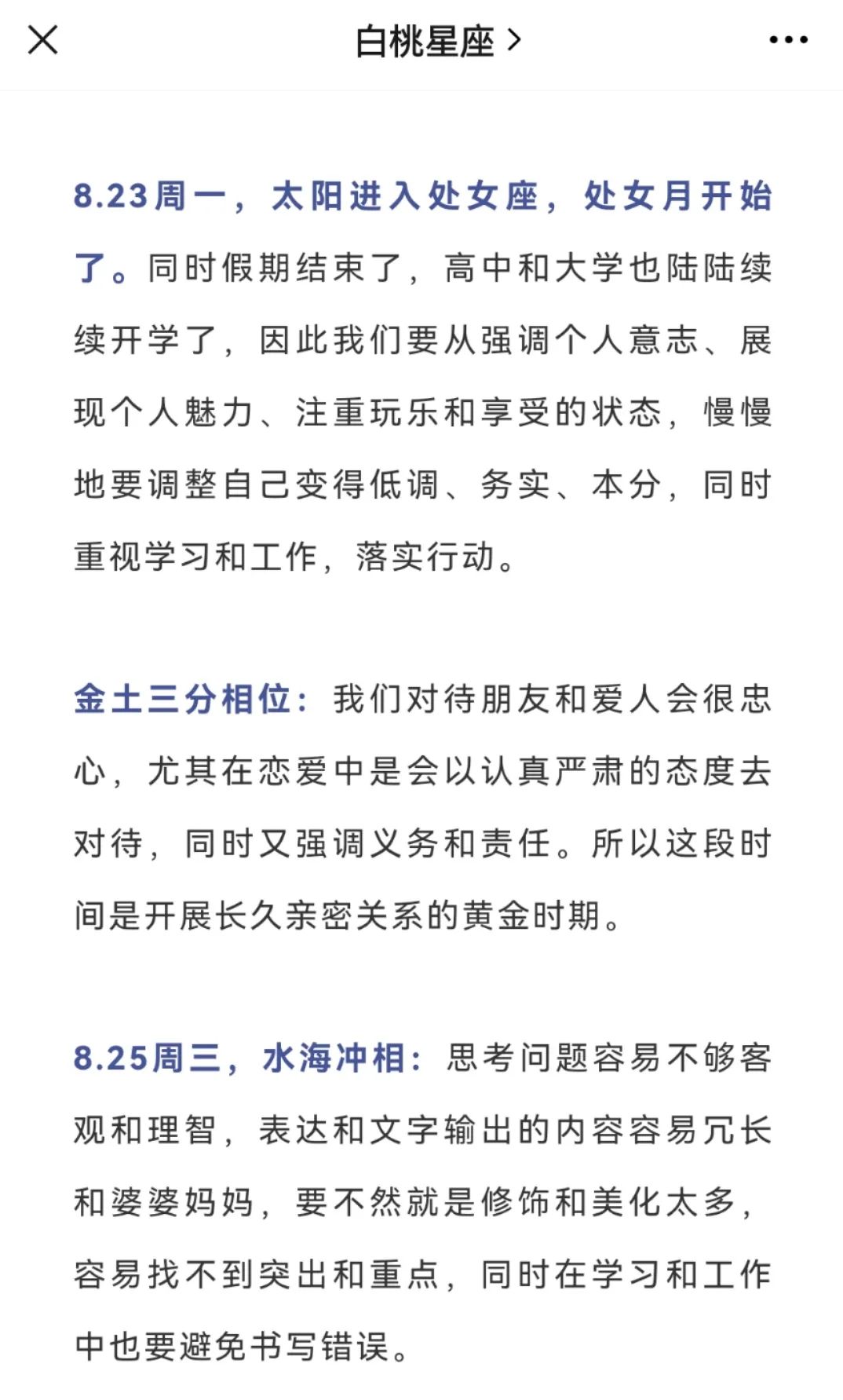 每週星座運勢則在陶白白公眾號矩陣裏的“白桃星座”中推送,這一板塊重點在於預測下週的星座運勢。以天象為根據,陶白白從感情、學習、事業、財運、健康等方面對各個星座的運勢作出總結,並給出相應的對策,如“調節心情”“説話需要沉思”“注意防寒保暖”等,細心程度堪比老媽。