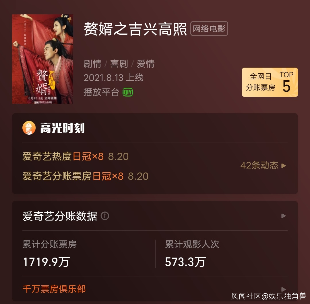 在整個上半年分賬票房破千萬作品數量同比去年上半年有所下降的網絡電影市場裏,由新麗電影、騰訊影業、閲文影視和愛奇藝出品的《贅婿之吉興高照》(下略《吉興高照》)依舊交出了站內預約人數超過150萬人次、上線兩週分賬票房破1700萬的優秀成績單。