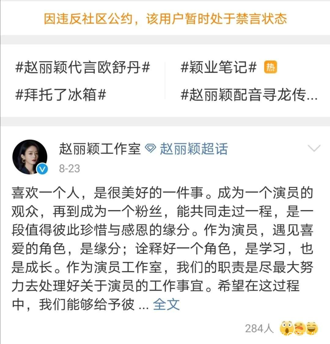 由於是頂風作案,8月23日下午,趙麗穎粉絲羣的多個官方微博或大V遭新浪微博禁言,這也是今年6月中央網信辦決定開展“清朗·‘飯圈’亂象整治專項行動”之後,首個因“互撕”遭大規模禁言的粉絲羣體。而趙麗穎工作室在被禁言後,才出來道歉,終於算是停止了這場混戰。