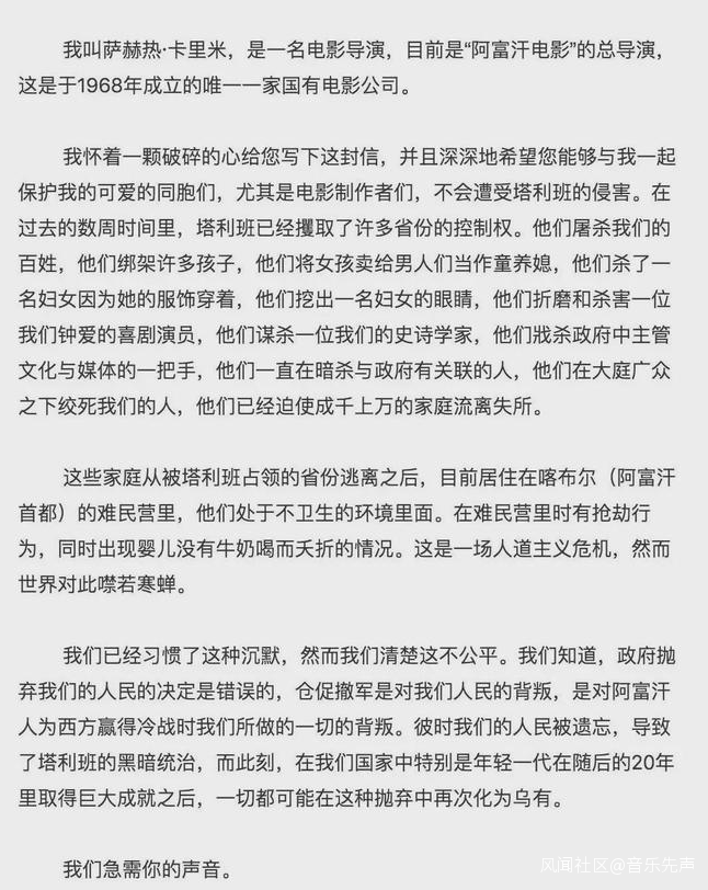 如今,塔利班捲土重來。現實打了卡里米們一記響亮的耳光,電影和音樂都沒能拯救阿富汗,徒留社交媒體上的一腔悲訴。“我在我的國家所努力創作的一切都將毀於一旦”,從此後“我們的聲音、我們的表達都將被子彈壓制到沉默之中”。