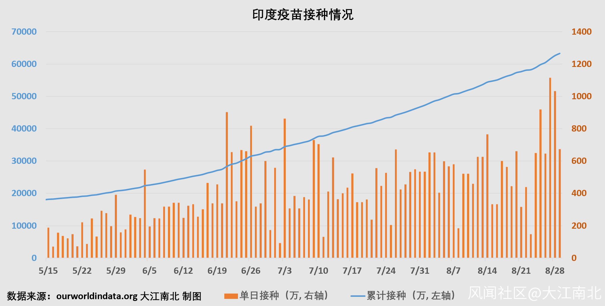 截止2021年8月29日,印度累計接種6.3259****億劑,列第二位,**其中單日新增接種673萬劑,印度疫苗接種的速度顯著加快。**印度至少接種一劑的人羣佔比為35.0%,完成接種的人羣佔比為10.4%。印度每百人累計接種45.84劑,是中國的31.7%。