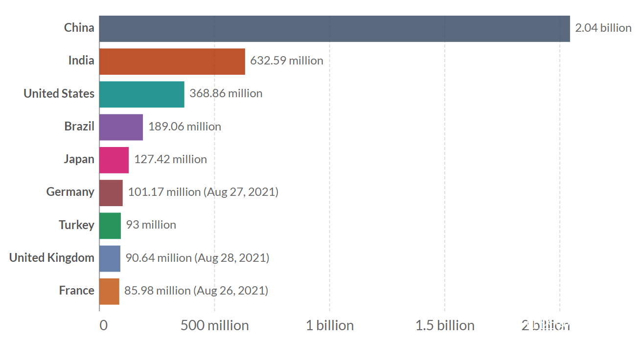 截至8月26日,中國大陸累計報告接種新冠病毒疫苗超過20億劑次,疫苗接種總人數達到10億7250萬人,覆蓋了全國人口約76%,位居全球主要國家之首,比美國高16%;其中完成全程接種人數達8億8943.9萬人,佔比為63%,位居全球主要國家之首,比美國高12%****。