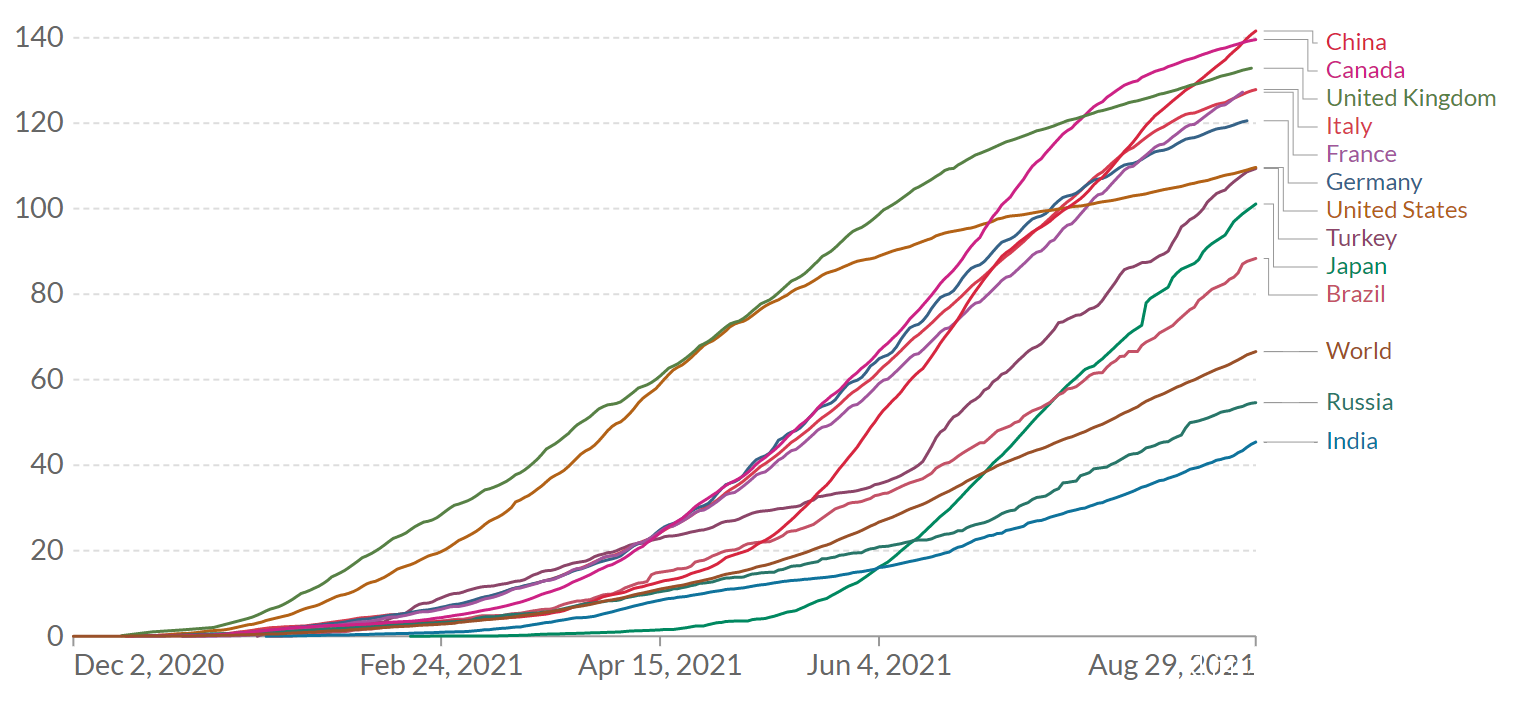 截止2021年8月29日,中國大陸累計接種新冠疫苗20.4463億劑,繼續位居全球第一位,佔全球累計接種劑數的39.0%;其中單日新增接種1169萬劑,佔全球單日接種劑數的41.2%。中國每百人累計接種144.83劑,環比增加0.83劑,是美國的1.31倍,位居世界主要大國之首。