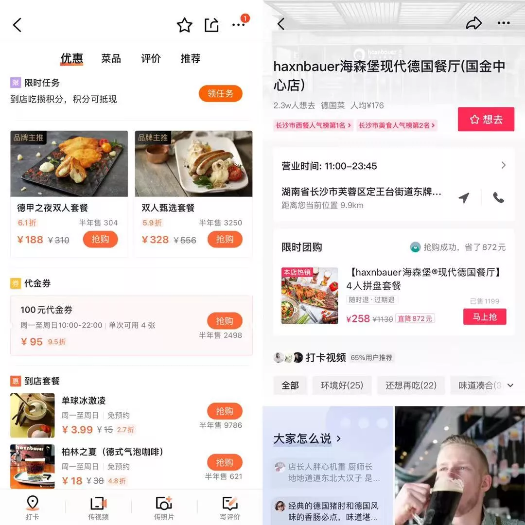 更進一步從產品上來看,美團APP與美團點評APP其實是一對互補的雙子星,美團App更強調功能性,往下滑動的瀑布流,更多是店面的介紹,而大眾點評的查找性強、娛樂性強、信任度高。